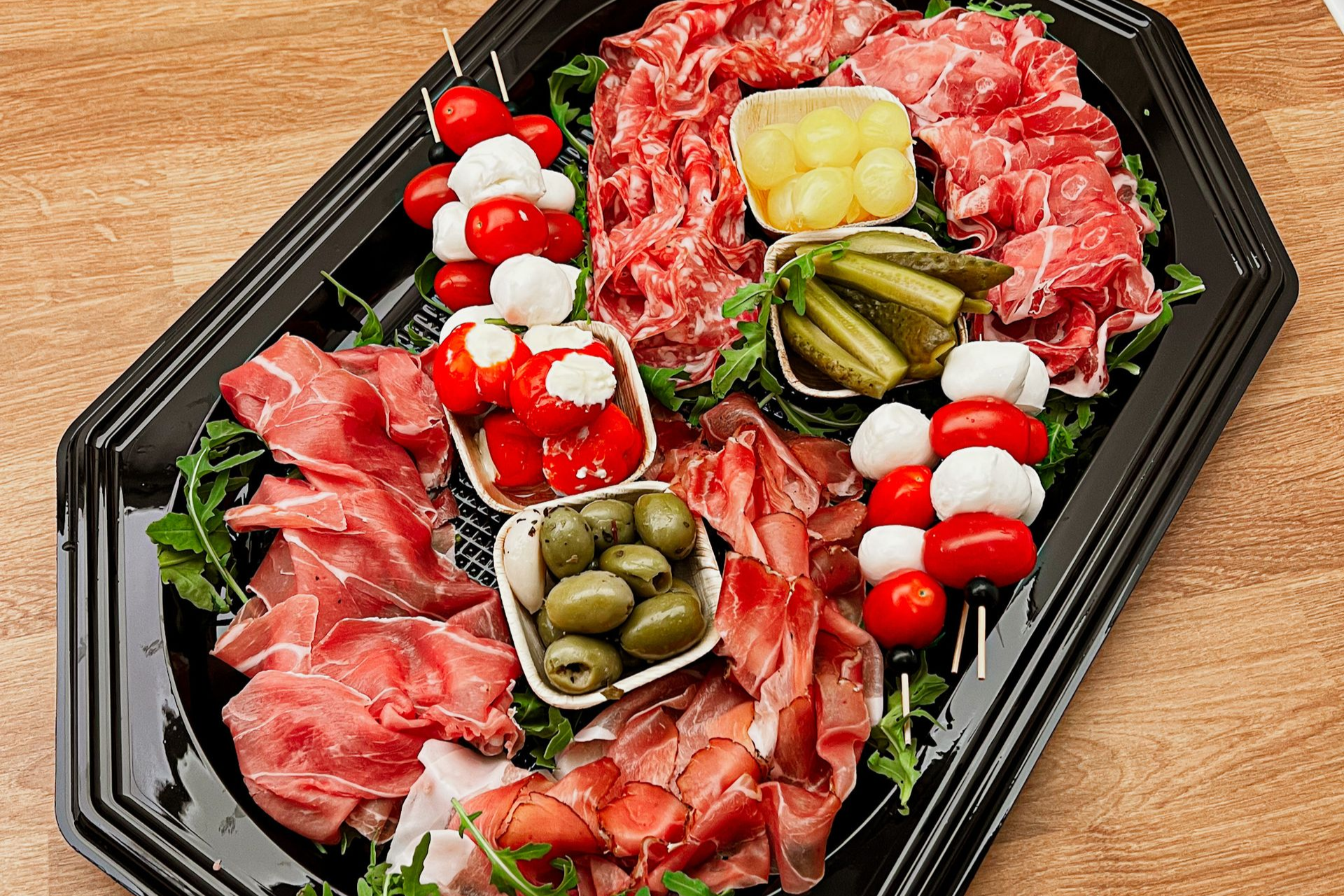Div. soorten gedroogde ham - Caprese sticks - Cornichons - Amsterdamse uitjes - Gevulde pepers - Olijven